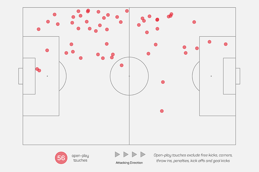 Al met al werd de terugkeer van Tomiyasu als basisspeler een goed-nieuws-verhaal. In totaal kwam hij tot 62 balcontacten over de hele wedstrijd, met als positieve uitschieter dus zijn dribbel in de zestien van Sparta bij de 2-0 van Steven Berghuis. Op de onderstaande afbeelding zie je op welke plekken de Japanse verdediger aan de bal was. Het gaat hier om 56 balcontacten tijdens open spel. Balcontacten bij een standaardsituatie zijn eruit gefilterd.