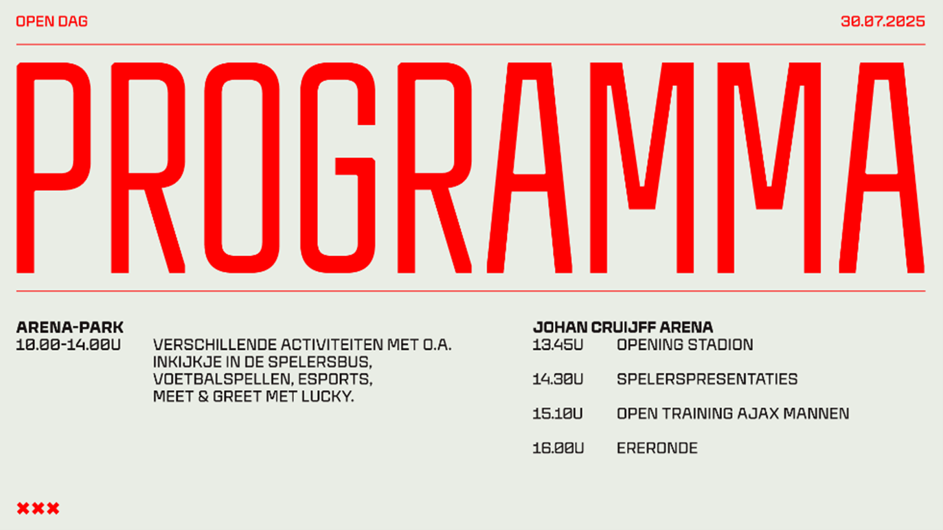 Op woensdag 30 juli zijn alle Ajacieden van harte welkom op de Ajax Open Dag 2025. De dag staat in het teken van ons dierbare rood en wit. Tussen 10:00 en 16:00 uur valt er van alles te beleven in en rondom de Johan Cruijff ArenA.